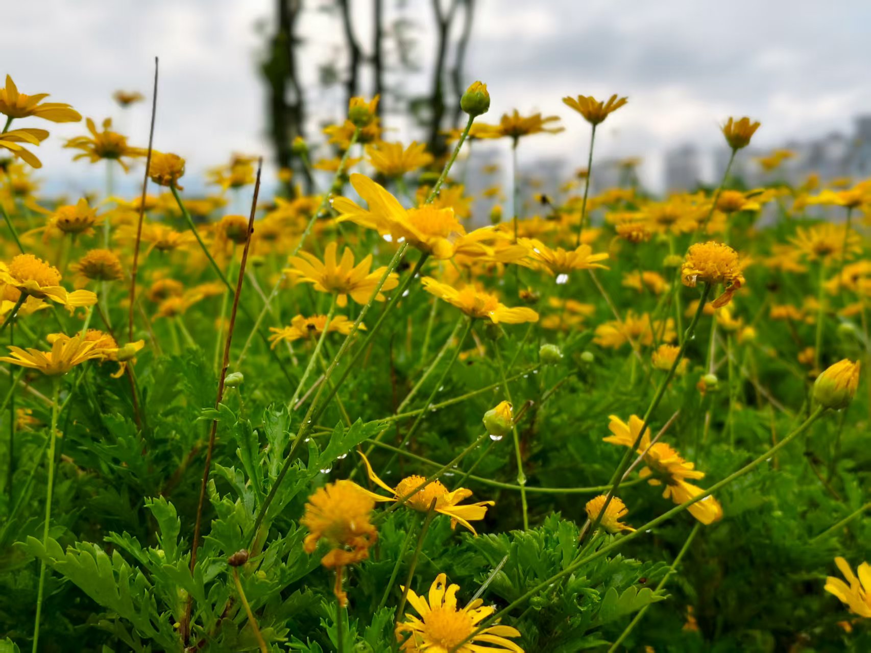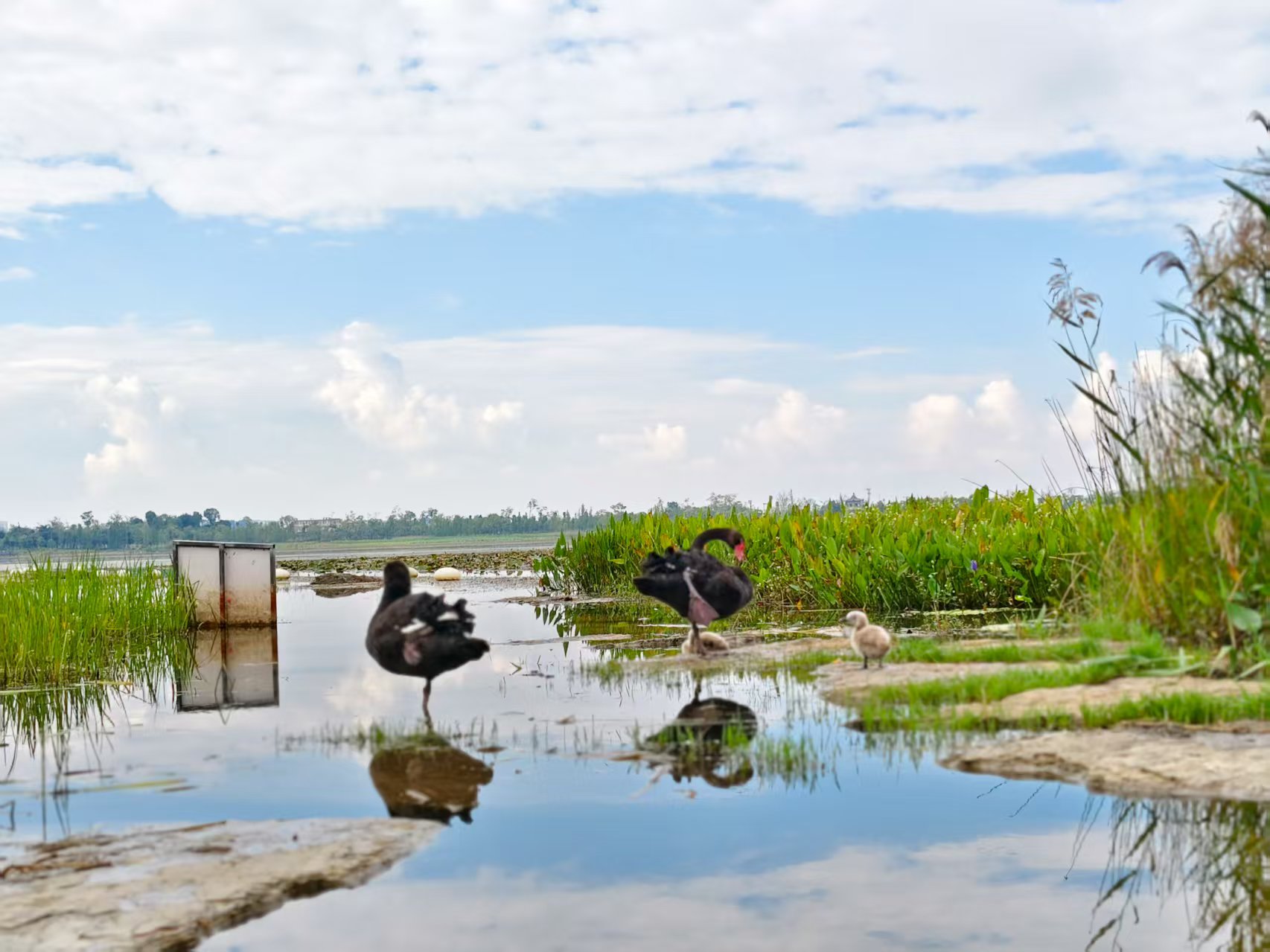 大片金黄的小花在草地上肆意绽放,星星点点,像把阳光揉碎了洒在那儿,露珠挂在花瓣上,随着微风轻轻晃动,仿佛下一秒就要坠落,却又总在即将滑落时稳住,俏皮又可爱。水边的黑天鹅悠然自得,羽毛在水光与天光的映照下,泛着油亮的光泽,偶尔低头轻啄羽毛,涟漪便在水面一圈圈漾开,和岸边的芦苇、远处的云影交织成一幅宁静的画。还有那几簇橙红的花,在绿意盎然的草丛里格外惹眼,露珠点缀其上,像给火焰般的花瓣戴上了珍珠耳饰,热烈又不失灵动。