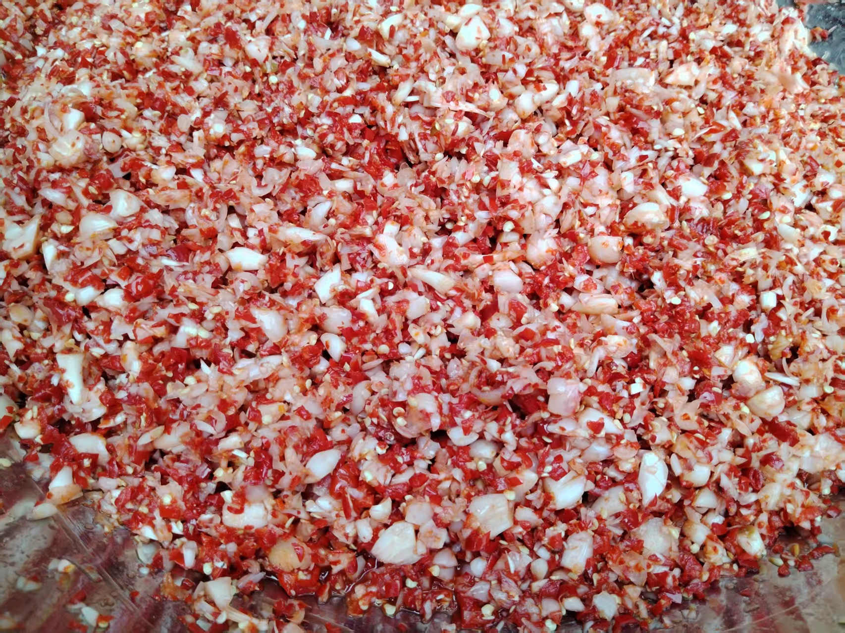 买回来的新鲜藠头去掉根须,在清水中反复淘洗干净并晾干,确保藠头表面无水渍,将藠头剁碎至颗粒状。辣椒要选择本地新鲜、表皮光滑、颜色鲜红、肉质厚实的红辣椒。将辣椒洗净晾去表面的水分,掐去把子后将辣椒切碎备用。