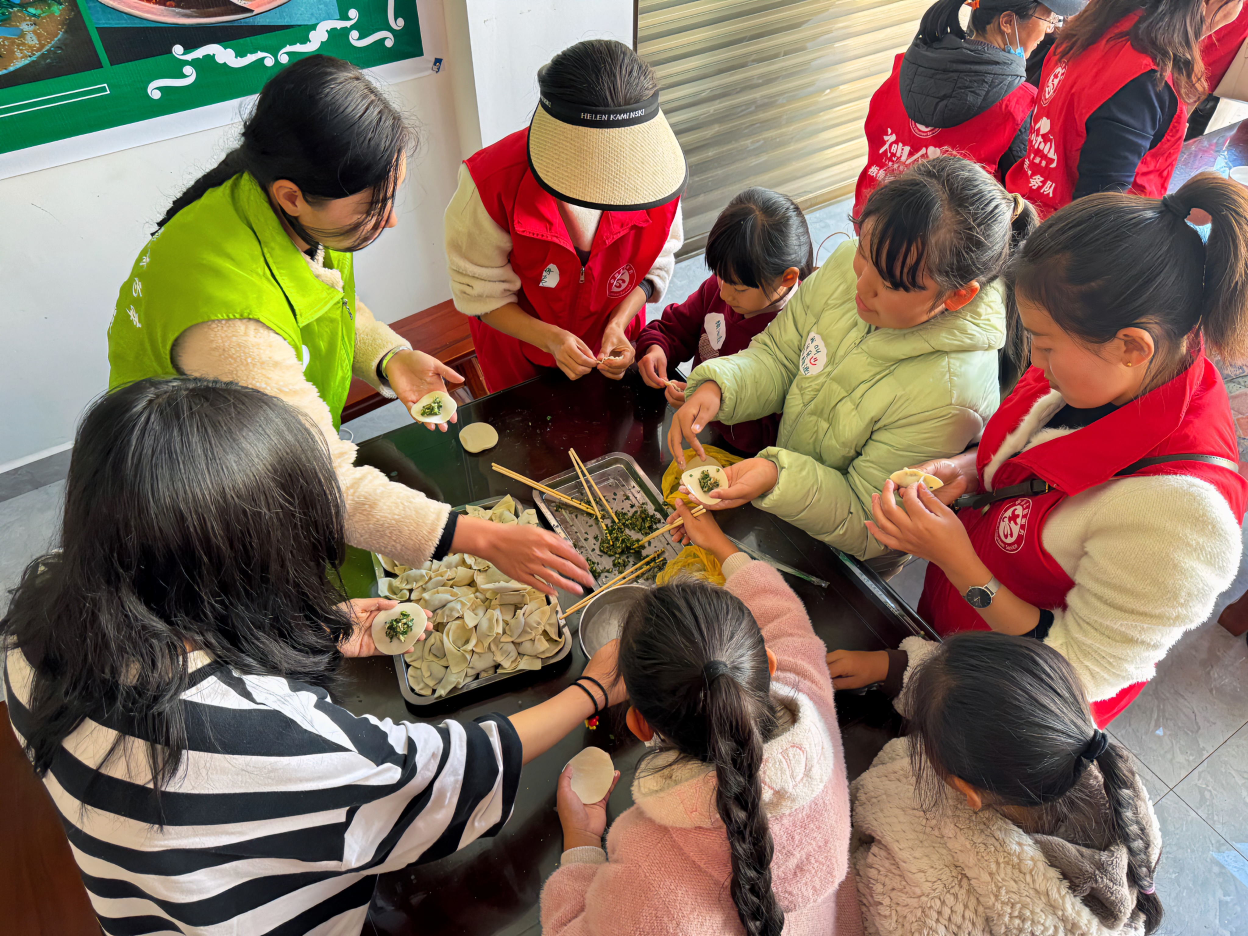 青莲社区百忍屯老年幸福食堂里,志愿者带领孩子们包饺子环节,培养了孩子团结协作的能力。