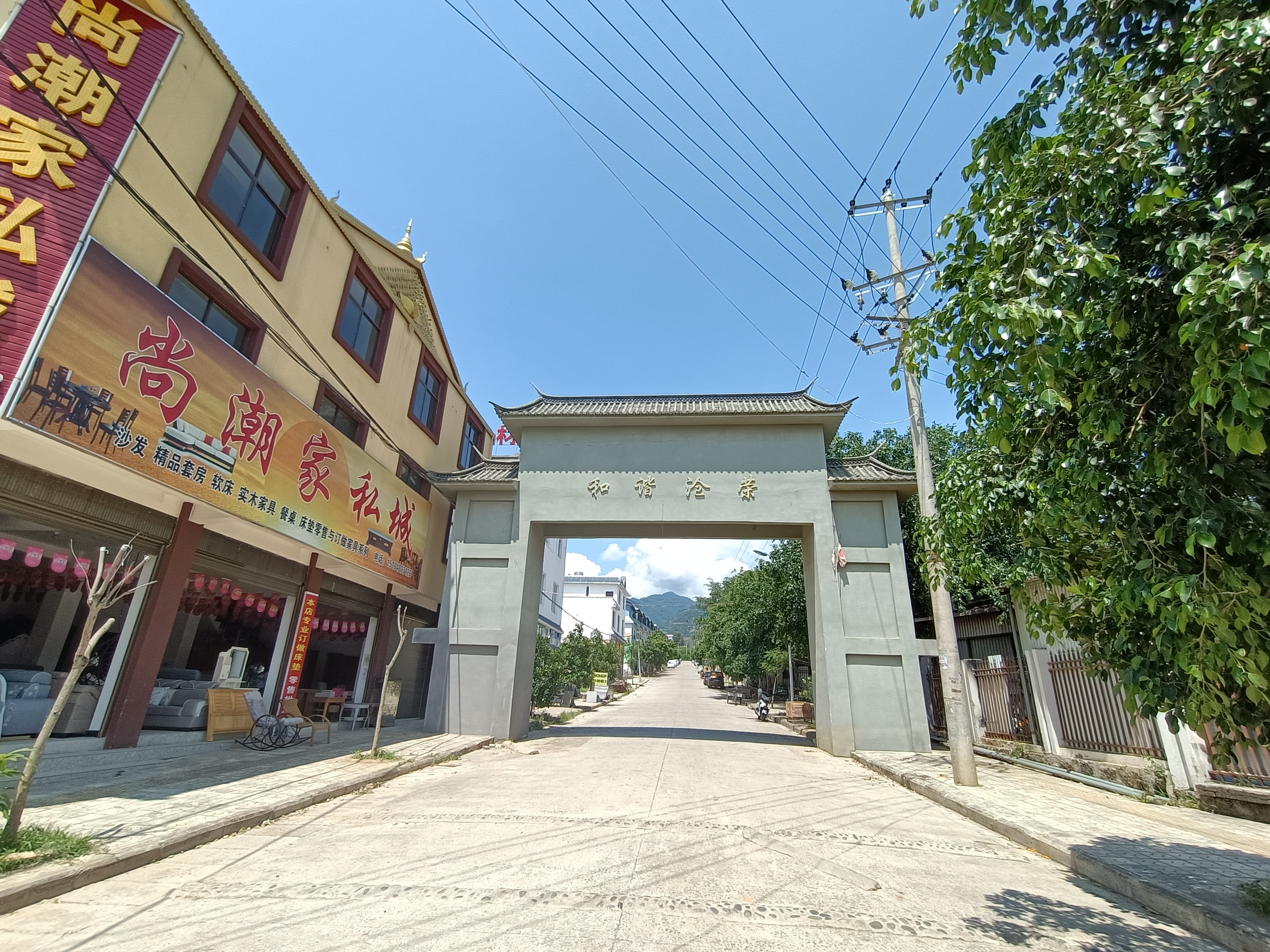 进入沧荣,率先映入眼帘的是一座大气却不失精美瓦蓝色一间二柱石牌坊,牌坊中央嵌有“和谐沧荣”四字。同行人告诉我,这个村子是2008年因小湾水电站建设水库淹没了他们的房屋以及土地才建起来的,由于搬迁到这里的人来自不同的三个乡镇多个村民小组,前后分四个批次,累计搬迁了113户528人,掺杂了汉、彝、白、傈僳、景颇、傣等多个民族,为了减少人与人、户与户、民族与民族之间的摩擦,于是便取名为“和谐沧荣”。