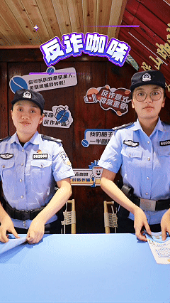 门口的警察小熊是第一道风景线,不同款式的制服让它们显得既可爱又亲切,走进店内反诈宣传更是“藏”在细节里,印着反诈标语的咖啡杯套、手提袋,设计感十足的特色反诈墙,每一处设计都把反诈宣传变得生动又好记,把安全宣传藏进了一杯咖啡的时光里。