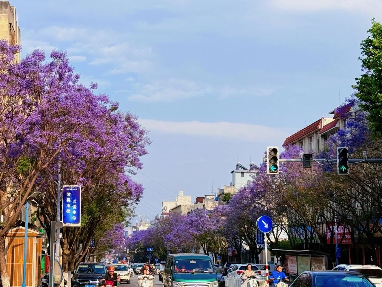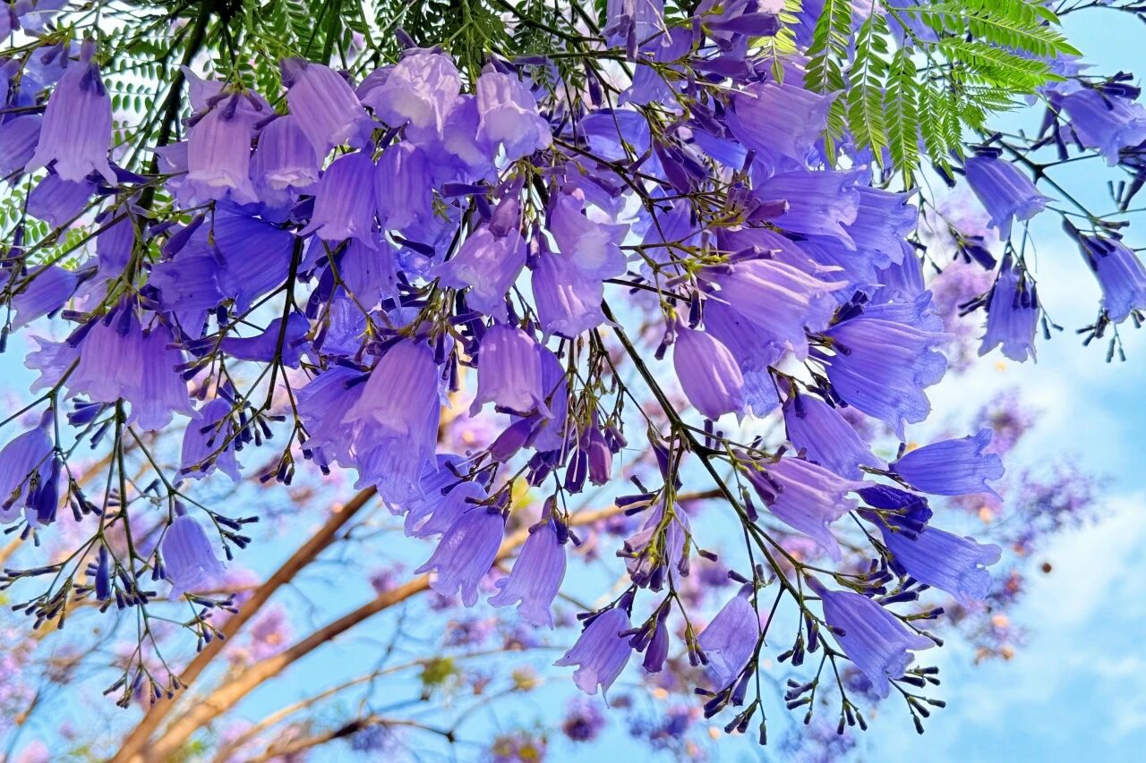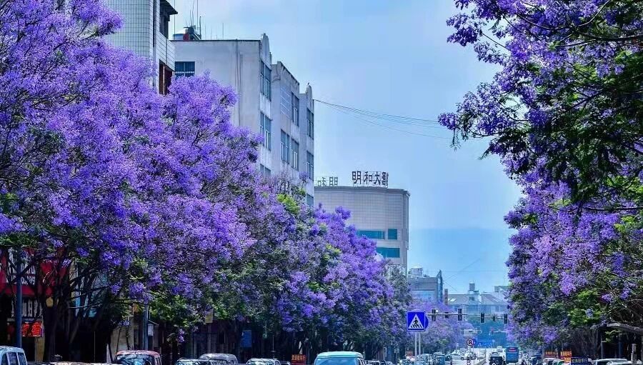 4月底至5月中旬,人民路的蓝花楹悄然绽放,将街道染成梦幻的紫蓝色。串串花朵如风铃般挂满枝头,微风过处,花瓣轻舞,地面铺就紫色花毯,仿佛奏响无声的浪漫乐章。晨曦中,阳光为花瓣镀上金边;晚霞里,紫蓝与霞光交映,如梦似幻。