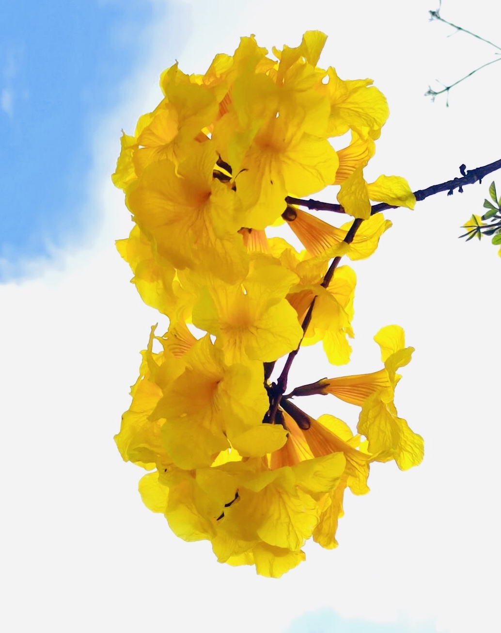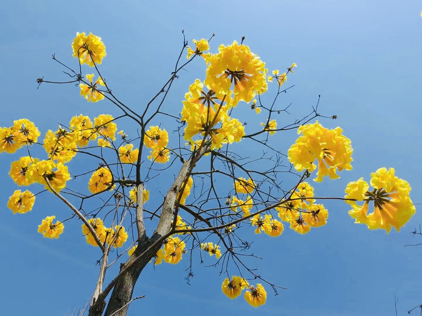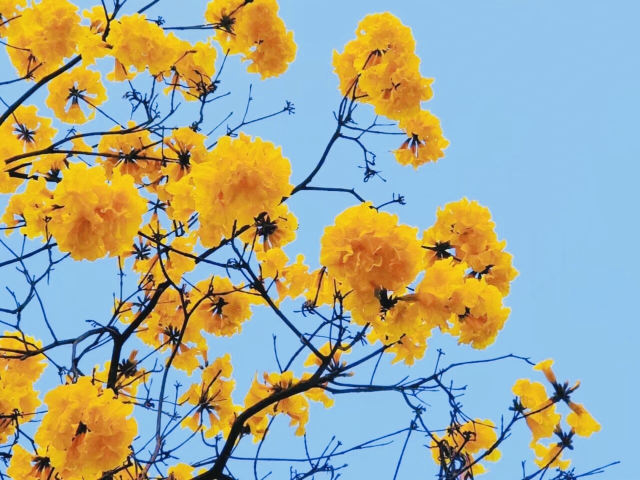 与此同时,玉泉路的黄花风铃木正值盛花期,满树金黄不见一叶,花型似风铃般摇曳生姿,尽显“满城尽带黄金甲”的壮阔景象。花语为“感谢”的黄花风铃木,与春日暖意相得益彰,漫步花海中,春风拂面,花香萦绕,成为游客难忘的春日体验。