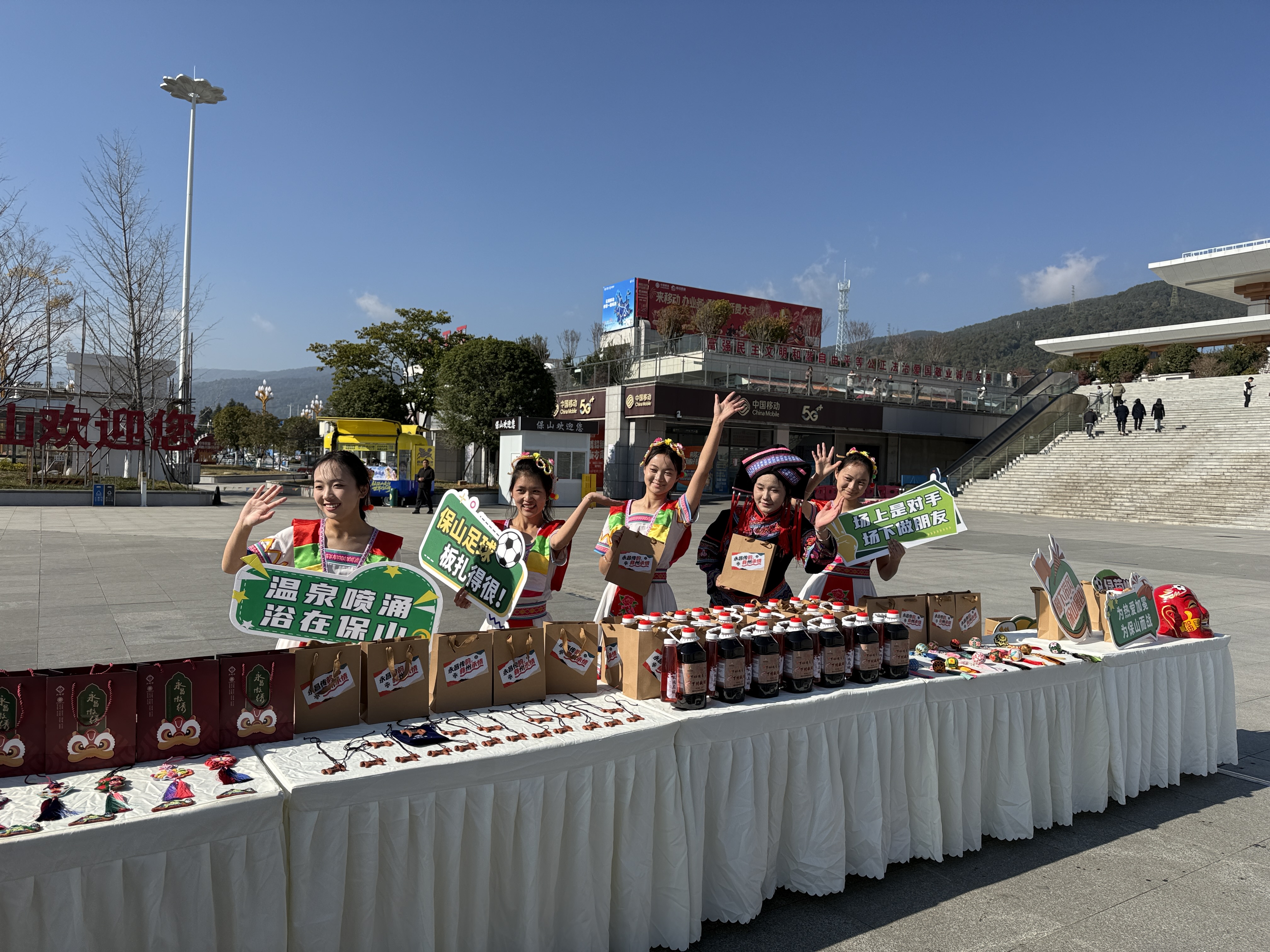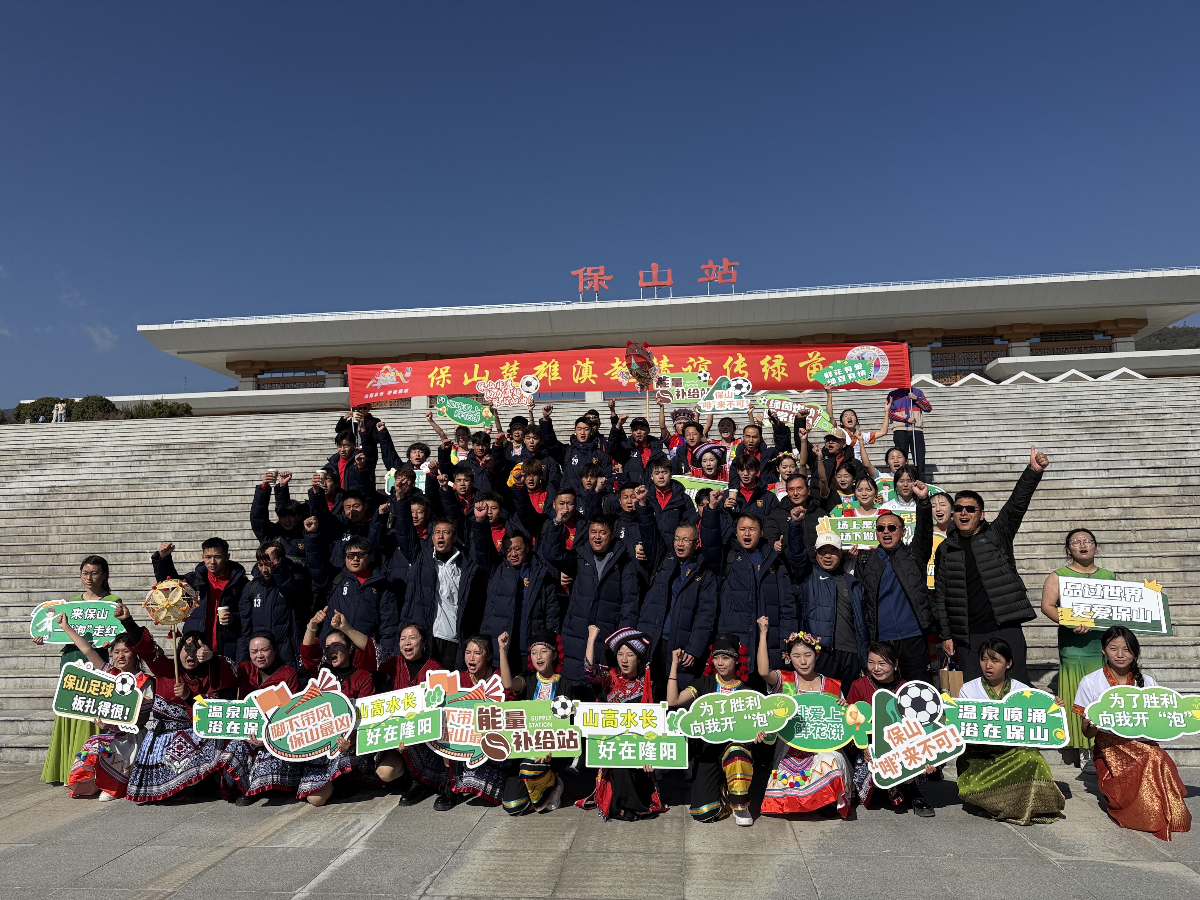 以体为媒搭桥梁,凝心聚力促团结。1月2日至3日,隆阳区将滇超联赛第三轮赛事打造为民族团结进步宣传主阵地,构建“赛事竞技+文化展示+情感联结”的融合场景。在保山站赛场,隆阳区以民族歌舞展演、保山小粒咖啡品鉴、本土特产展销等形式举办特色欢迎仪式,让远道而来的各族球员、球迷第一时间感受“家的温暖”,彰显“各民族宾至如归”的团结氛围。赛场内外同步开展“云南民歌大家唱”“非遗集市”“滇超燃情夜·打歌聚兰城”等活动,集中展示永昌墩绣、下村麸醋等12项区级以上非遗项目,15名非遗传承人现场展演技艺,让各族群众在观赛之余沉浸式感受多民族文化魅力。通过“以球会友”搭建起跨区域民族情感交流桥梁,生动诠释了“各民族像石榴籽一样紧紧抱在一起”的深刻内涵。