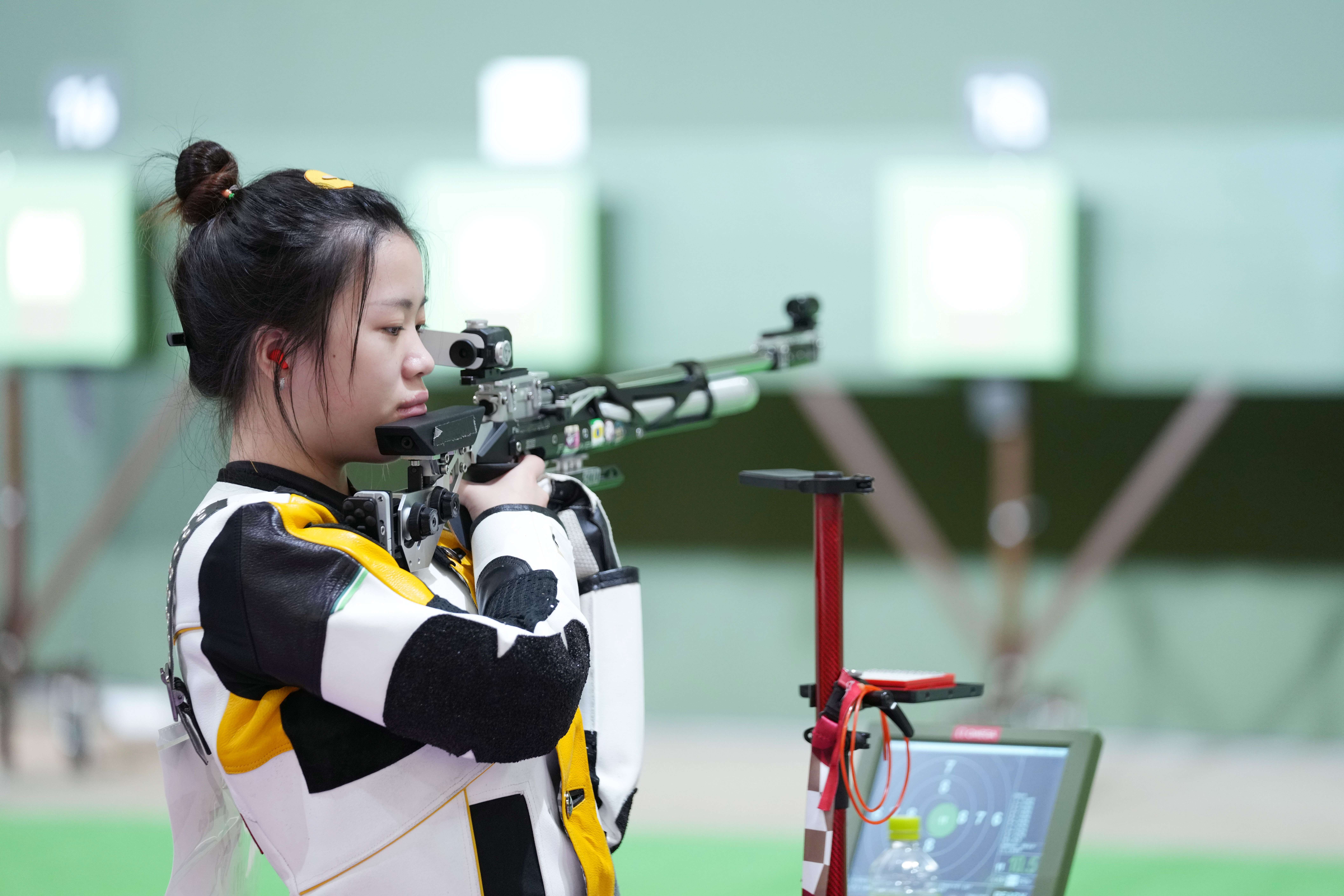 2021年9月18日,杨倩在第十四届全运会射击女子10米气步枪团体赛决赛中。新华社记者孙非摄
