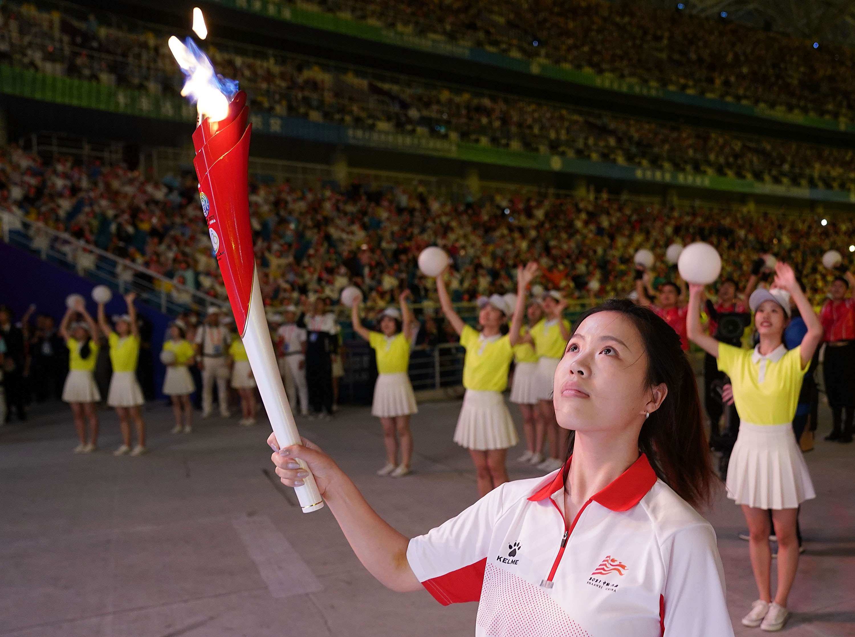2021年9月15日,第十四届全国运动会开幕式火炬手杨倩仰望点燃的主火炬。新华社记者彭子洋摄