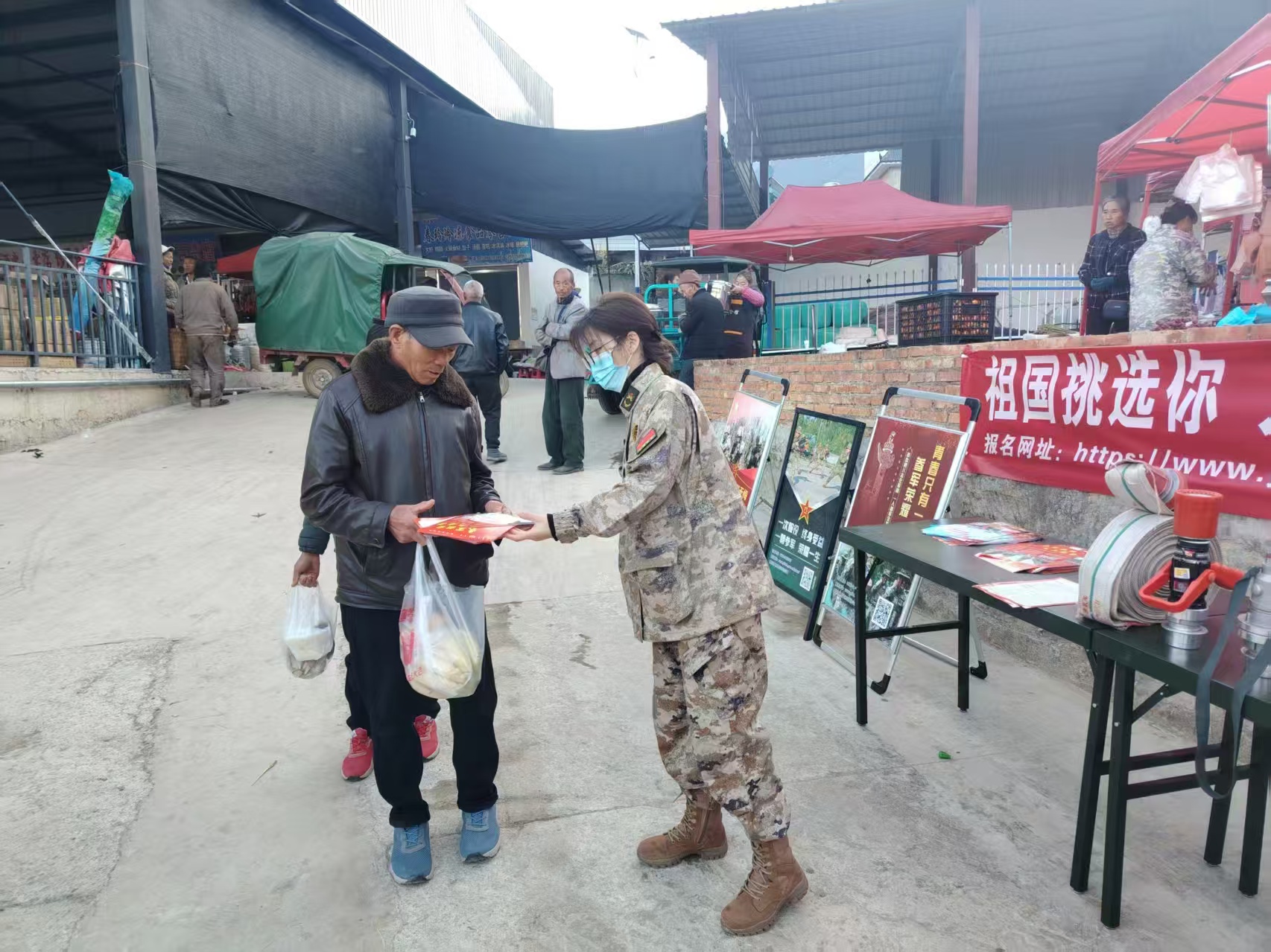 集市上,红色的宣传帐篷一立,“一人参军全家光荣 一次服役终身受益”“孩子去当解放军 爸爸妈妈最放心”的横幅一拉,瞬间成了集市里的“焦点打卡点”。瓦房乡人武部的工作人员身着迷彩服,化身征兵“宣传员”,一边忙着给赶集的村民递上宣传手册,一边用方言讲解征兵政策:从入伍年龄、学历要求,到报名流程、优抚待遇,再到军营的发展前景,讲给大家听。