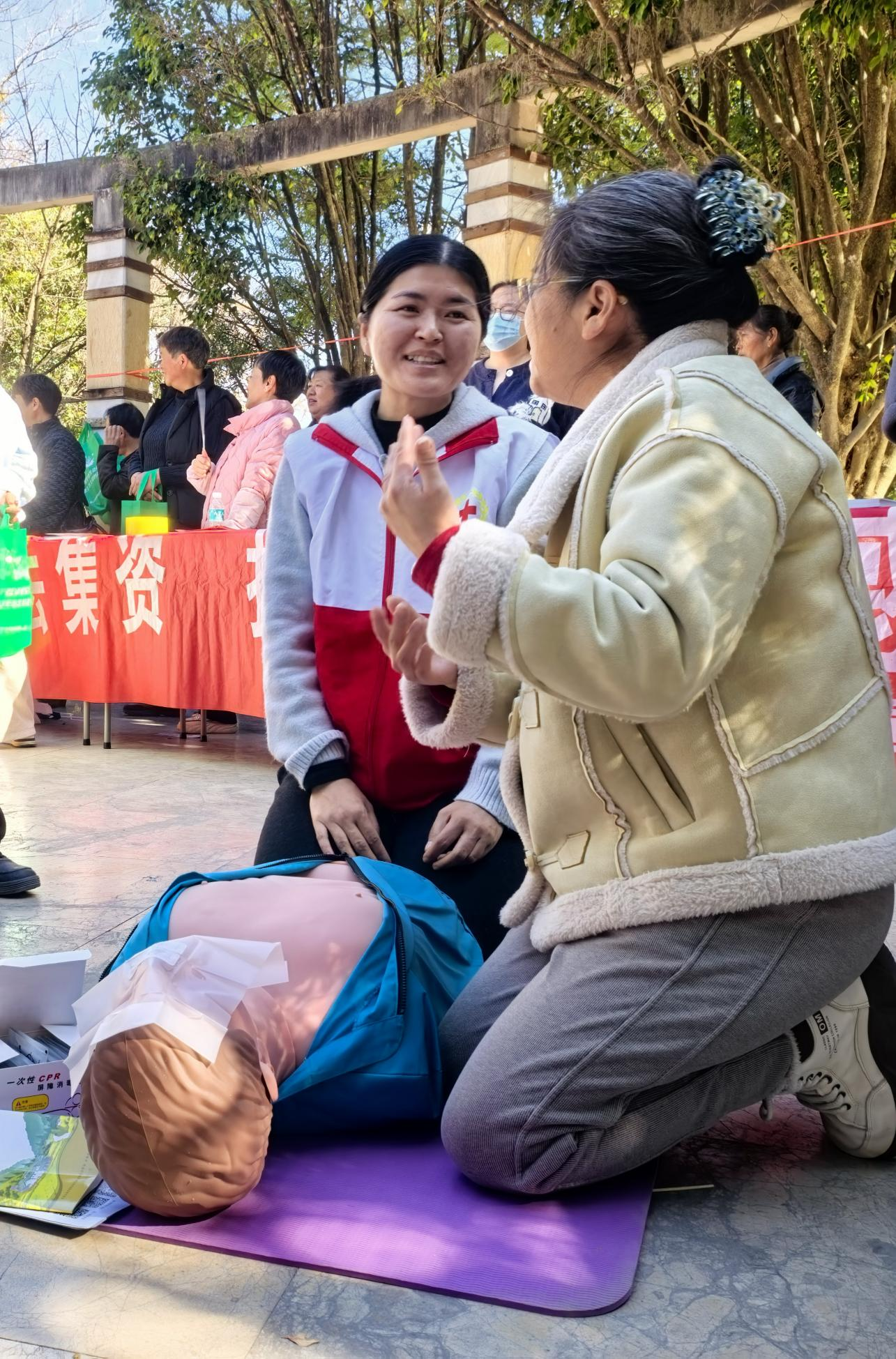 在马里社区永昌街心花园内、在沈官社区党群服务中心门前,翰墨飘香、温情涌动。区委组织部老干部局的书法志愿者们挥毫泼墨、笔走龙蛇,将对社区群众的美好祝愿倾注于笔端,将千家万户的祈愿落笔成春。顷刻间,一副副寓意吉祥的春联、圆润饱满的“福”字跃然纸上,传递着传统文化韵味,更承载着真挚的节日问候。居民们围聚在案前,喜笑颜开地挑选最合心意的一副,仿佛已将新岁的期盼握在手中。在新春福礼发放点前,前来参加活动的居民也早早排起了队伍,一份份精美的门神、窗花被送到居民手中,让传统的年味在指尖流转,融融的暖意在人群中悄然蔓延。在急救知识宣传点前,区红十字会的志愿者借助“模拟人”等设备手把手向居民讲解、演示心肺复苏、海姆立克急救法以及除颤器的操作方法。九隆、青华街道的志愿者也为广大居民朋友宣传交通、消防、食品等安全知识,提供政策咨询服务。