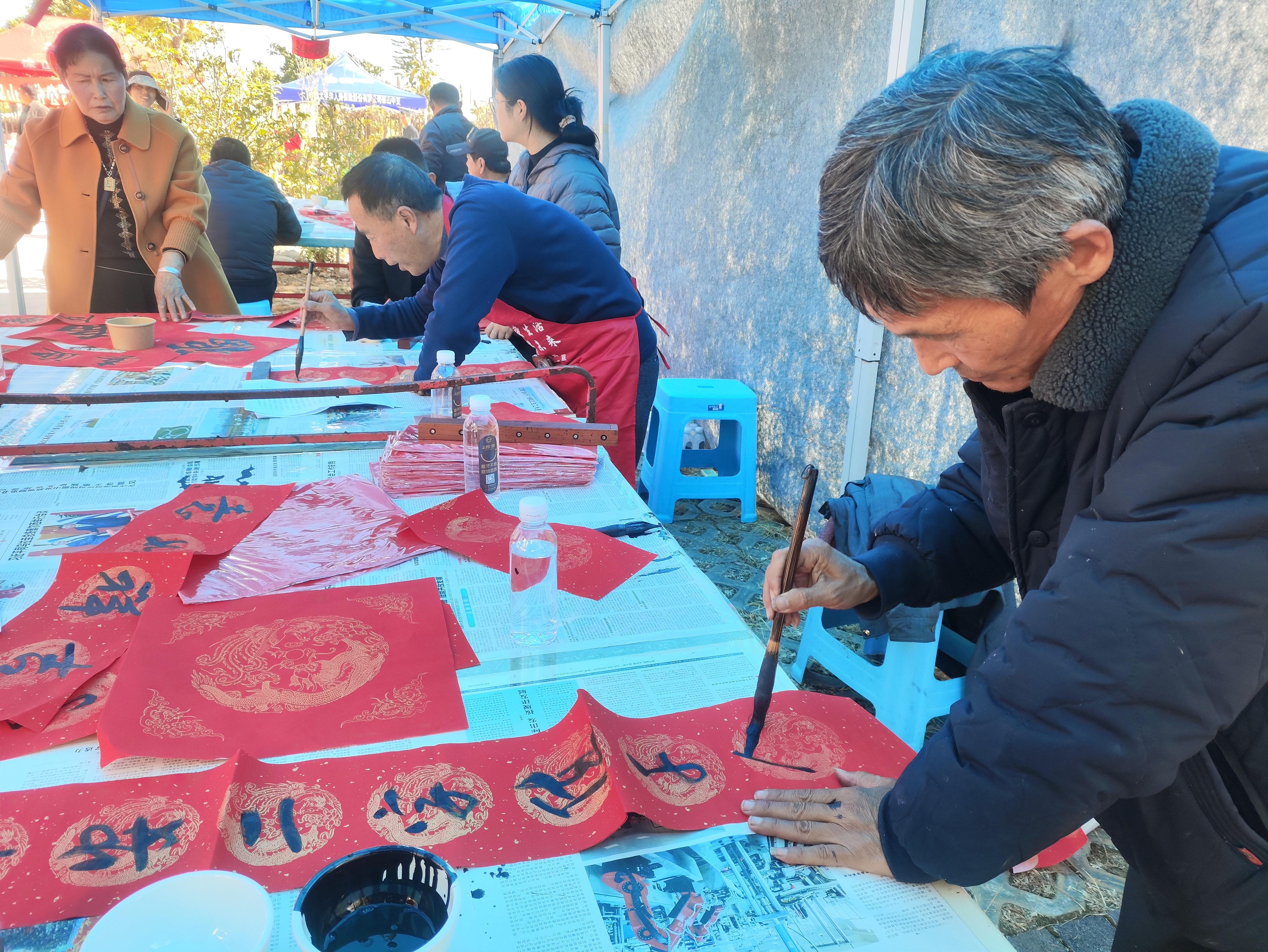 活动现场暖意融融,红纸铺案、墨香沁脾。社区书法爱好者与志愿者早早到场,挥毫泼墨、笔走龙蛇,一幅幅笔力遒劲的“福”字、对仗工整的春联接连诞生,既有“金马驰光开盛世,春风送暖入华堂”的马年佳句,也有“家和万事兴”的温情寄语,传递着对美好生活的向往与邻里和睦的正能量。