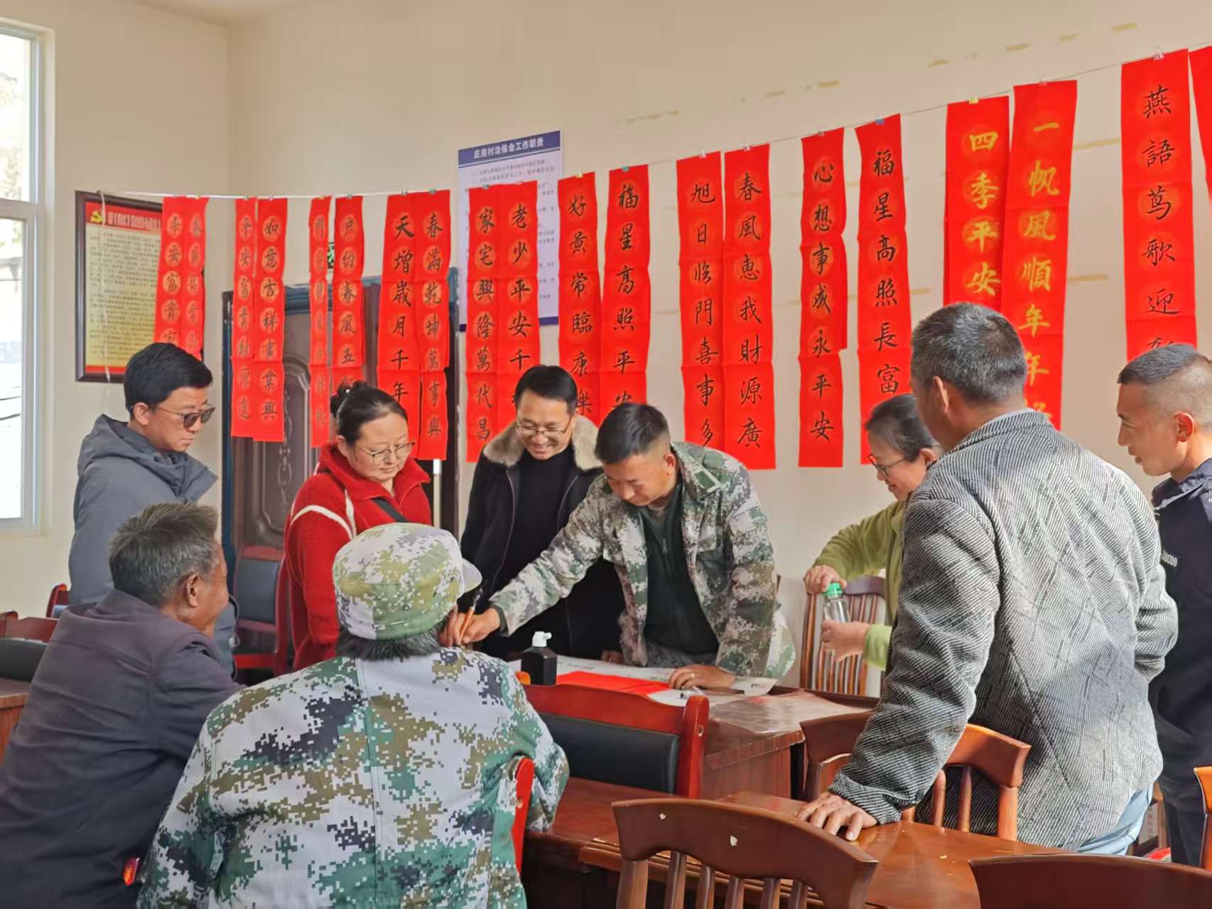 云瑞村的写春联活动现场一片热闹,村民们围在桌前细细品读联句,欣赏书法创作,互道新春祝福。“还是手写的春联最有味道,一贴上,年就到了!”手捧春联的李大娘笑容满面。庄房村同样暖意融融,驻村工作队与书法爱好者们展纸挥毫,把一副副寓意吉祥的春联送到乡亲手中,部分春联还由村干部与工作队专程送至监测户家中。累计送出春联200余副。各村积极组织开展“清洁家园”行动,党员干部带头,村民自发参与,共同清扫村道、整理庭院、清运垃圾。一番热火朝天的劳动后,村容村貌焕然一新,以整洁优美、文明有序的姿态迎接新春,展现出昂扬向上的乡村新风貌。