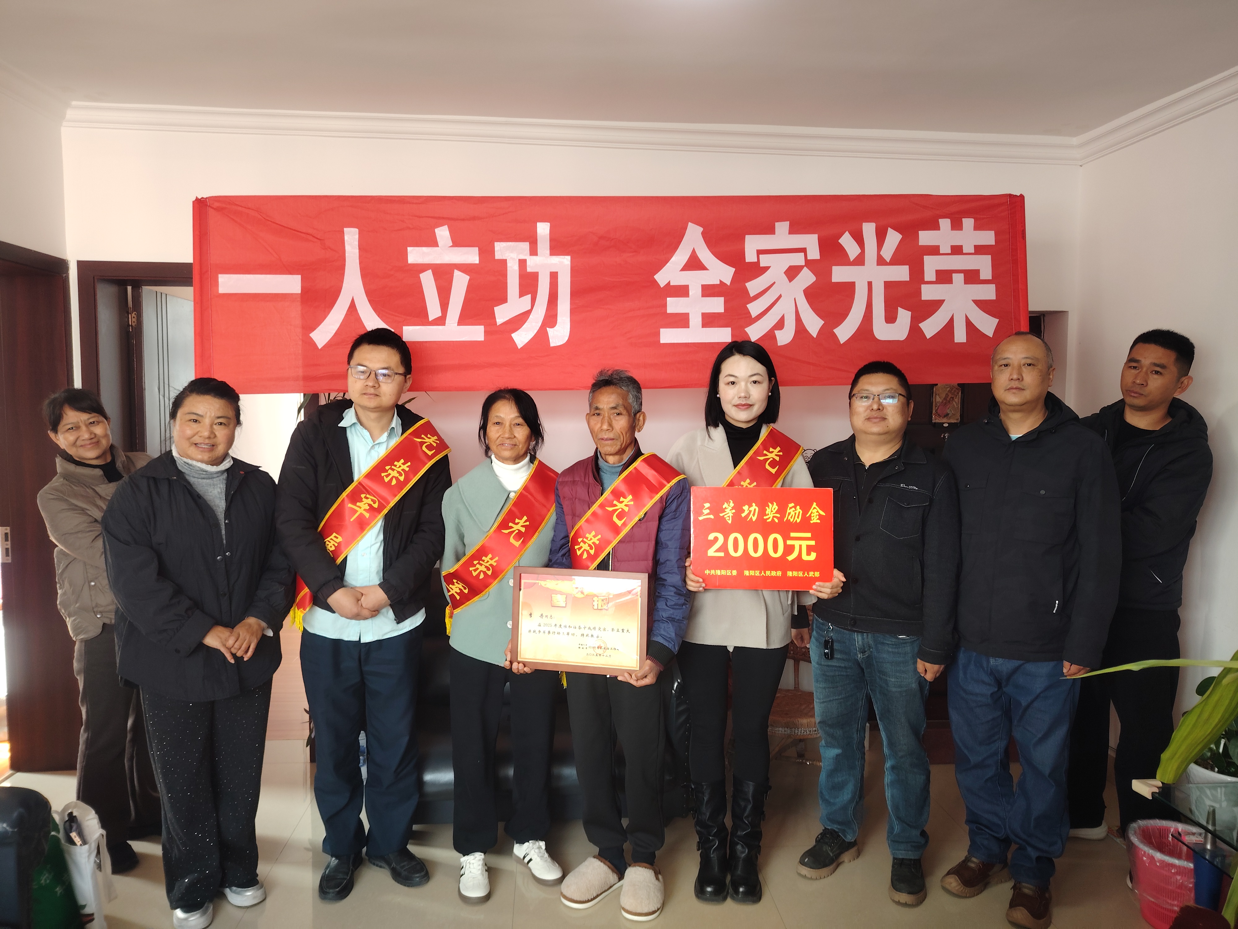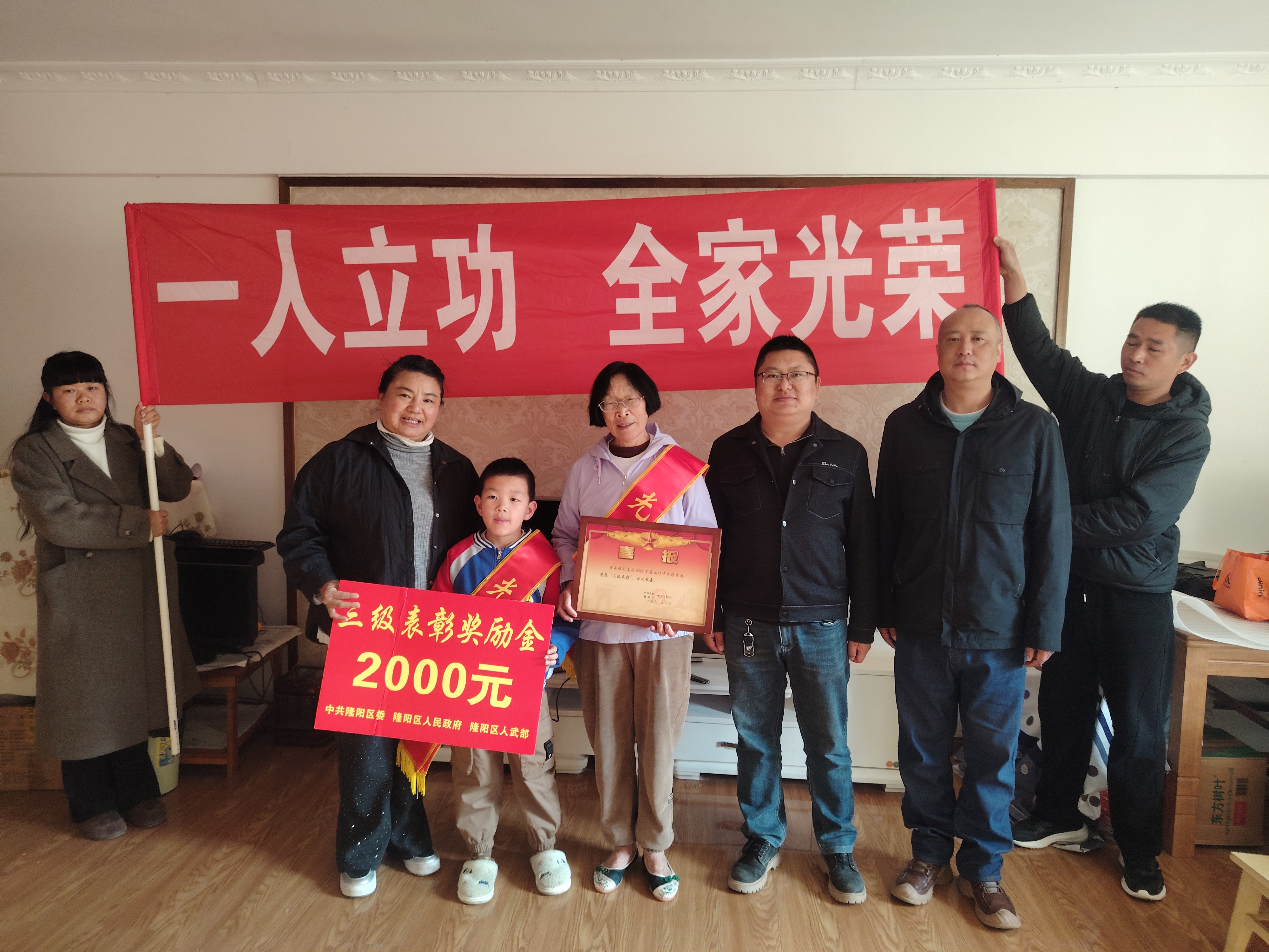 2月27日,区武装部、区退役军人事务局、九隆街道联合组成送喜报小分队,为荣立三等功的现役军人家庭送去立功喜报与慰问金,让军人军属共享荣光。