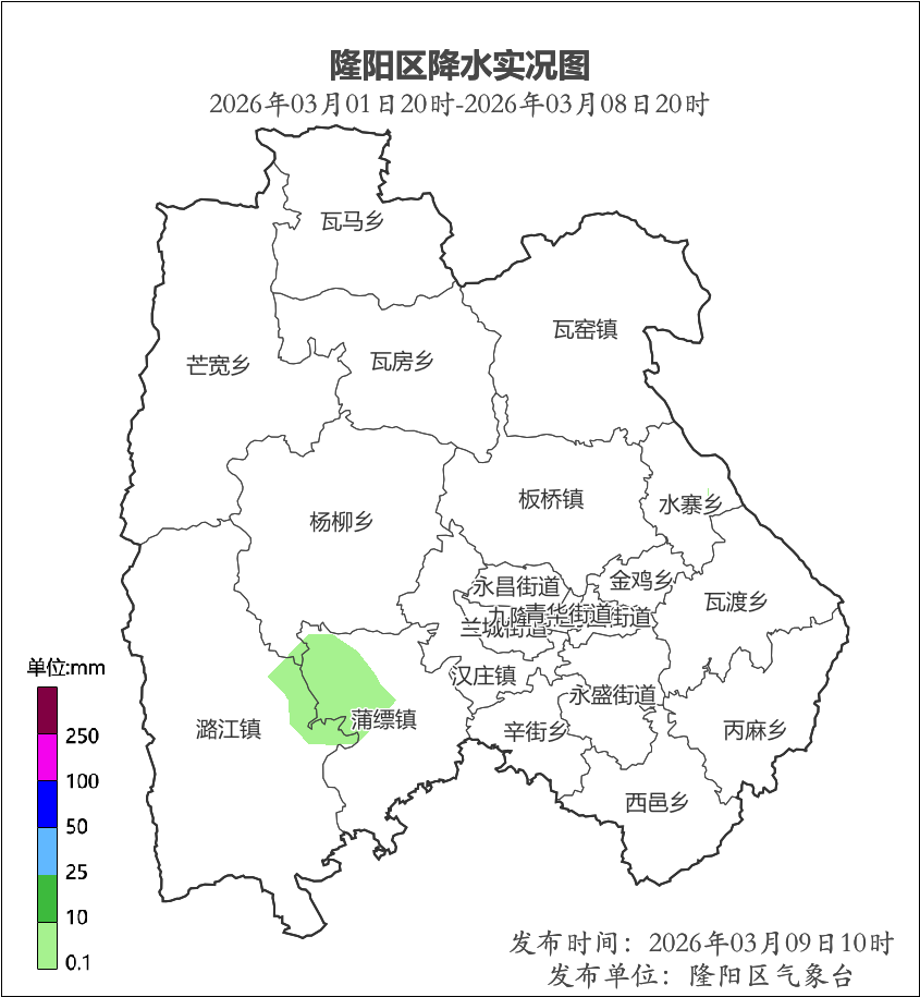 受偏西气流影响,上周我区大部以晴到多云天气为主。累计降水实况:有3站采集到降水量,最大降水量出现在蒲缥马街,降水量为0.7mm。