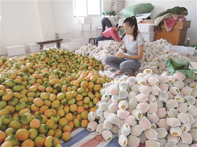 根据当下的市场行情,按照精品果每公斤8至9元的均价,少数管理极好的柿田,亩产可达4吨,精品果占比超80%,亩均效益可达3.3万元;多数管理较好的柿田,亩产可达3吨,亩均效益可达1.5至2万元;即使进行粗放式管理,销售次品果,按1.2元每公斤的交售价格,亩均效益也可达5000元至7000元;全镇每年还外销种苗20余万株,实现收益100余万元,由此可见甜柿产业对促农增收的作用。另外,近两年来,全镇还每年向友邻乡镇或县区输入甜柿种植技术工2300余人次,指导在甜柿种植中的修枝打杈、嫁接改良等工作,以此增加劳务收入。
