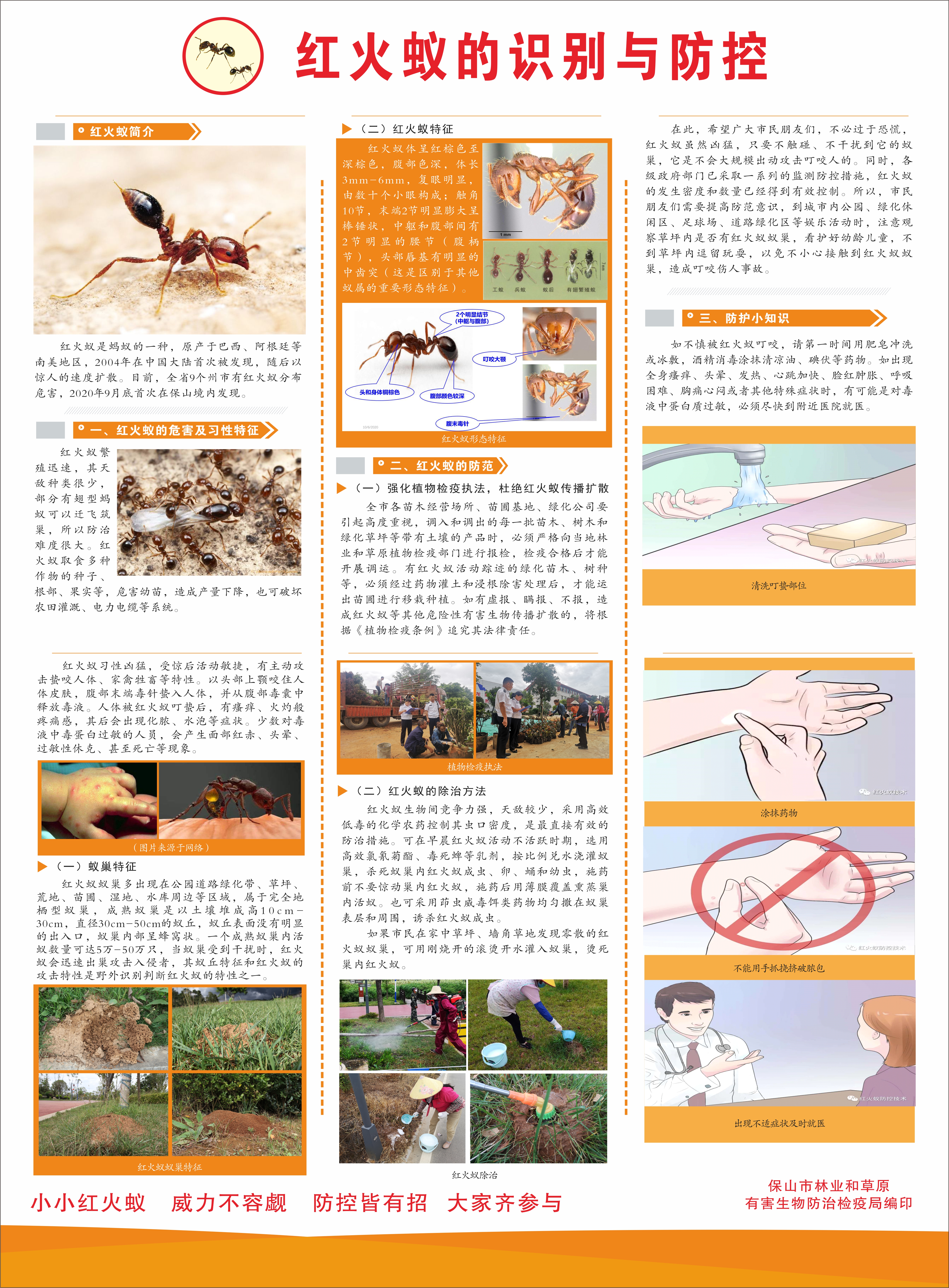 根据《云南省林业和草原局公布林业检疫性有害生物疫区的通知》(云林发【2020】42号),红火蚁目前分布于云南省9个州(市)31个县(区),保山市周边昆明市、楚雄州、玉溪市、红河州、文山州、普洱市、西双版纳州、德宏州、丽江市,目前均为红火蚁疫区。同时隆阳区周边的龙陵县、施甸县、昌宁县,今年也相继暴发红火蚁危害,隆阳区防控形势严峻。